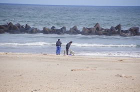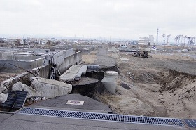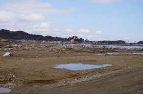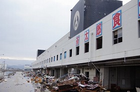 左側:旧市場の建物です。建物の損傷もさることながら前面の道路だった部分が地盤沈下により海水が溜まってしまっています。