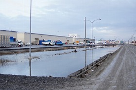 右側:仮設の市場が建てられています。しかしこちらも地盤沈下が酷く海水が溜まってしまっています。