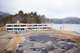牡鹿半島の様子です。海辺に立っていた谷川小学校は津波により甚大な被害を受けひっそりとしていました。